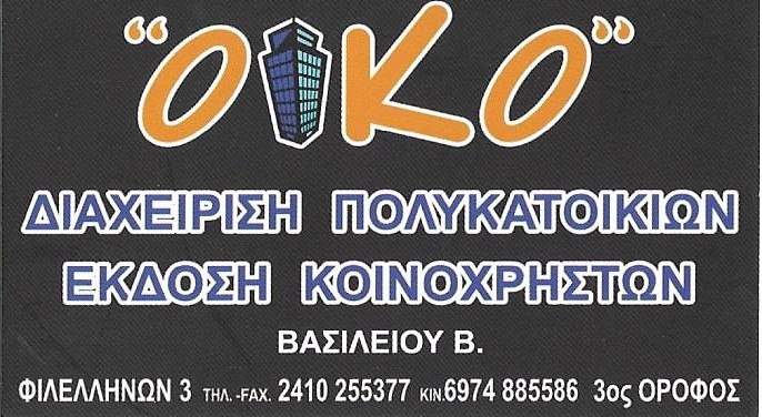 Η επιχείρηση "ΟΙΚΟ" εδρεύει στο κέντρο της Λάρισας και δραστηριοποιείται στο χώρο παροχής υπηρεσιών πολυκατοικιών.